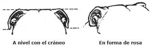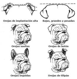 Orejas: De inserción alta, es decir que el borde delantero de cada oreja (vista de frente) toque el borde del cráneo en su margen superior, de manera que estén lo más separadas entre sí, lo más altas y separadas de los ojos como sea posible. Pequeñas y delgadas “orejas en forma de rosa” es correcto, es decir que las arrugas internas caen hacia atrás, el borde superior, frontal interno,