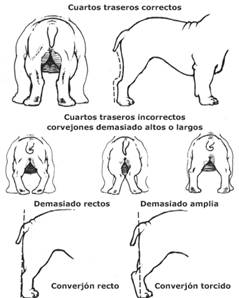 Apariencia general: Piernas grandes y musculadas en proporción, levemente más largas que las delanteras. Piernas largas y musculadas desde el lomo hasta el corvejón.