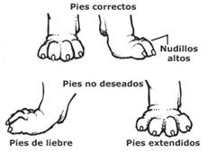 Pies posteriores: Redondos y compactos. Dedos compactos y gruesos, bien separados arriba, haciendo que los nudillos sean prominentes y altos.